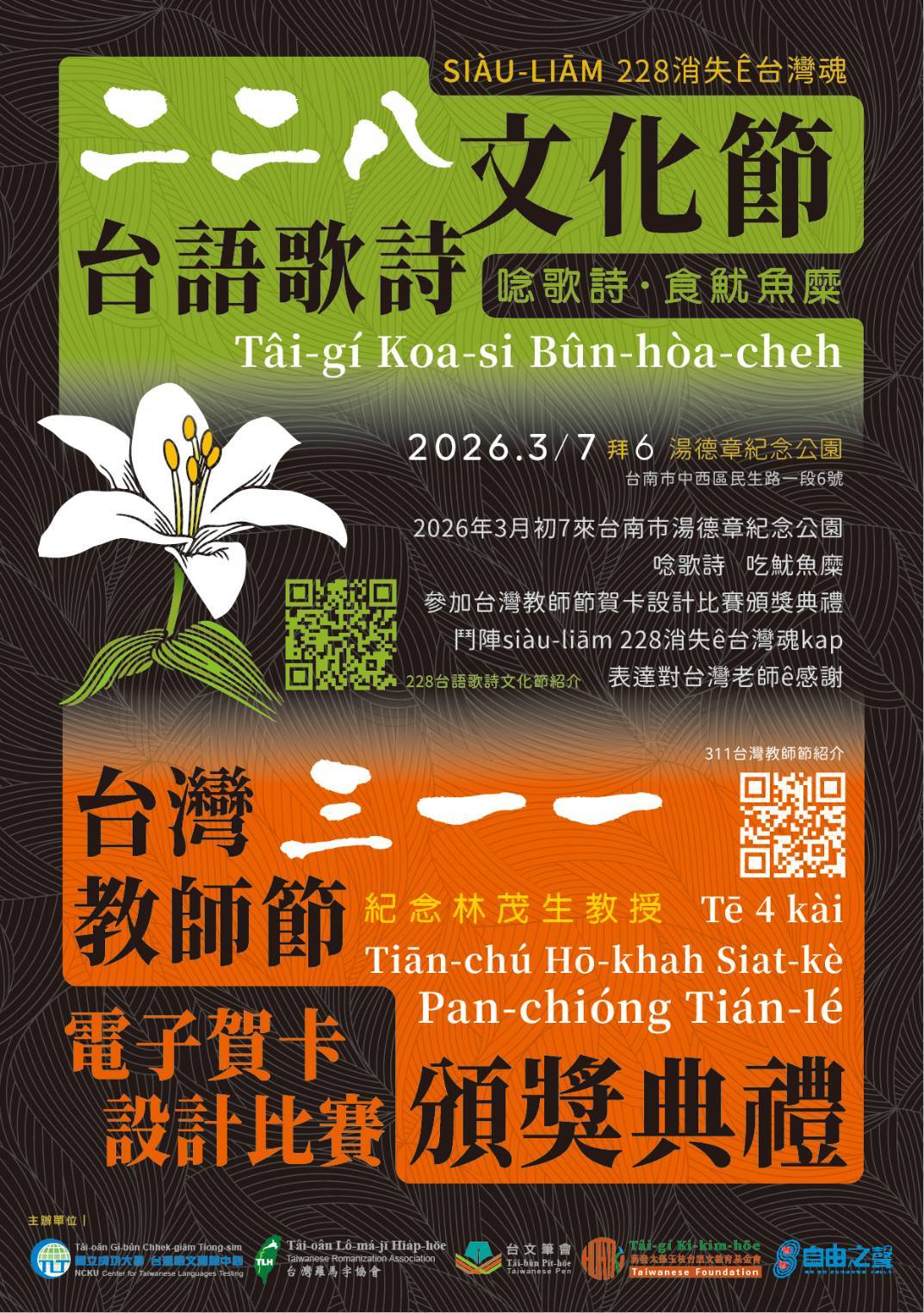 歡迎參加2026年二二八台語歌詩文化節& 311台灣教師節頒獎典禮